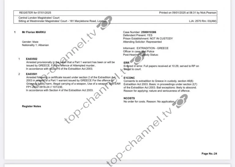 Top Channel shkruan se disponon dokumentin e gjykatës së ekstradimeve të Londrës, sipas së cilës bazuar në një urdhër arresti ndërkombëtar, ka arrestuar dhe ka nxjerrë përpara trupës gjykuese e cila i ka komunikuar akuzat që vijnë nga urdhri arrestit i Greqisë.