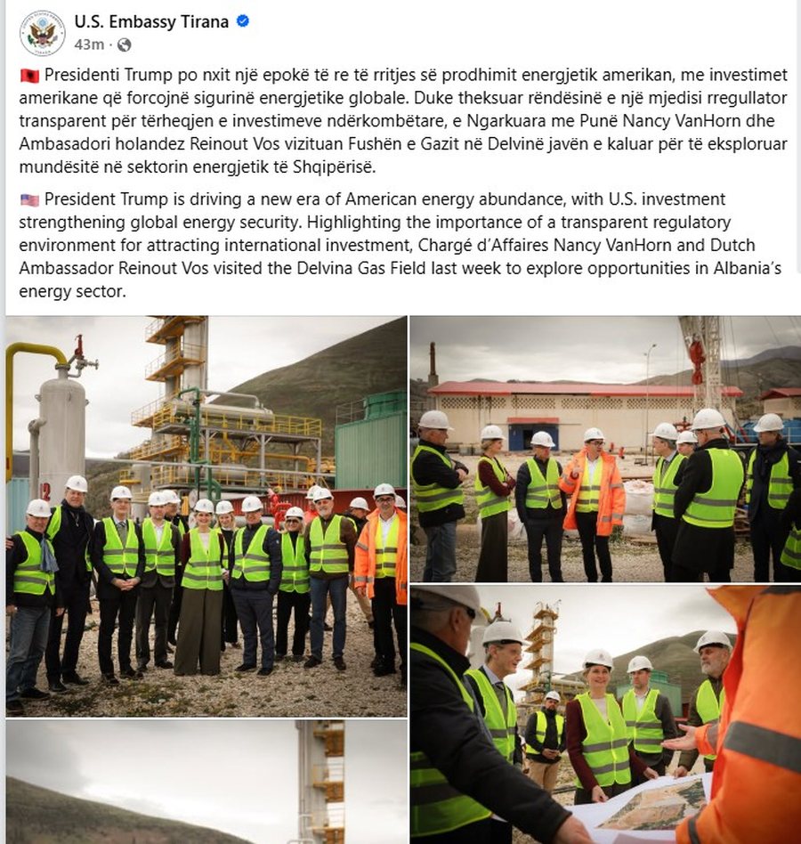 “Presidenti Trump po nxit një epokë të re të rritjes së prodhimit energjetik amerikan, me investimet amerikane që forcojnë sigurinë energjetike globale. Duke theksuar rëndësinë e një mjedisi rregullator transparent për tërheqjen e investimeve ndërkombëtare, e Ngarkuara me Punë Nancy VanHorn dhe Ambasadori holandez Reinout Vos vizituan Fushën e Gazit në Delvinë javën e kaluar për të eksploruar mundësitë në sektorin energjetik të Shqipërisë,” thuhet në postimin e ambasadës amerikane.