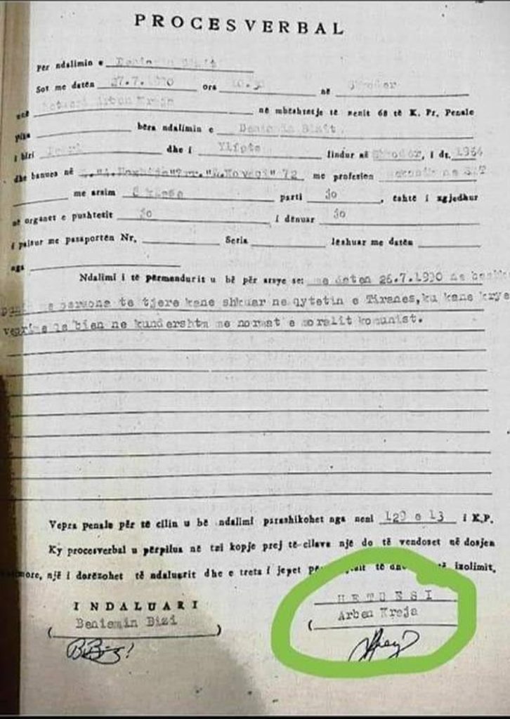 Berisha ka publikuar një dokument ku, sipas tij, prokurori i SPAK-ut, Arben Kraja, ka dënuar një të ri shkodran në vitin 1990 sepse nuk pranonte moralin komunist.