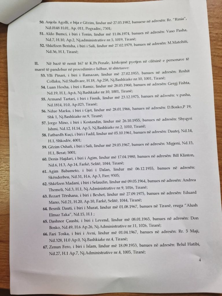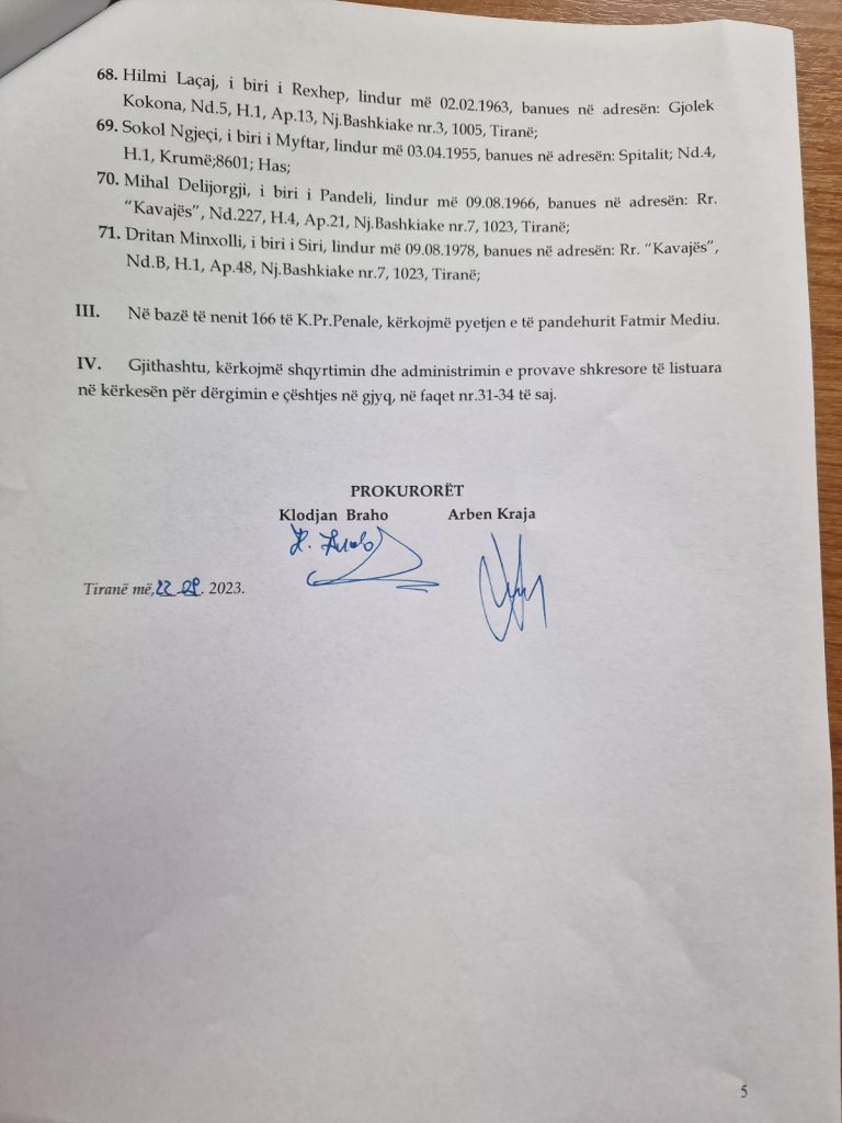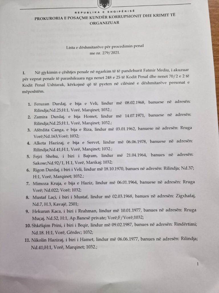 Në këtë seancë, Prokuroria e Posaçme ka kërkuar që të pyeten 52 dëshmitarë, mes të cilëve vetë Fatmir Mediu, ish-ministri Aldo Bumçi dhe Shkëlzen Berisha, djali i ish-kryeministrit Sali Berisha.