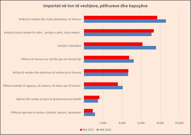 Importet e veshjeve dhe tekstileve në sasi ranë në të gjitha kategoritë gjatë 8-mujorit 2023 duke reflektuar kërkesën më të ulët të konsumatorëve për këto produkte.