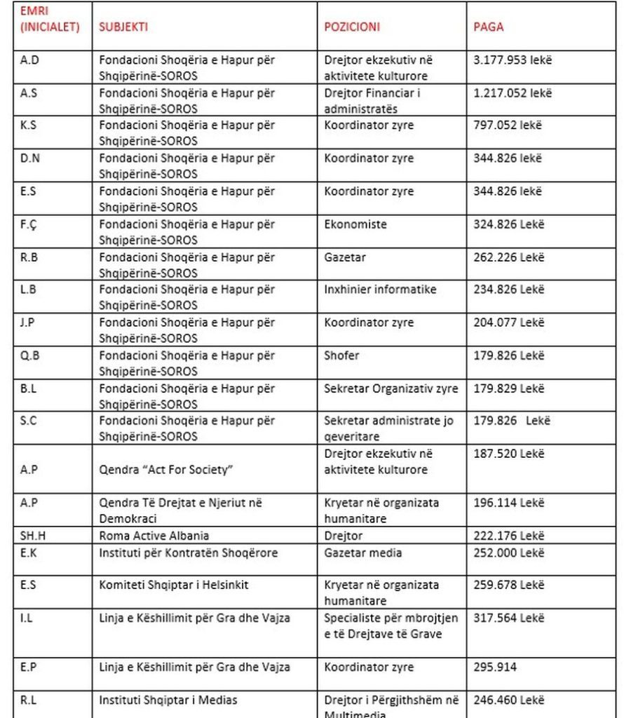 Në një liste që ka rrjedhur në media, e cila është marrë nga lista e pagave që doli në publik në vitin 2021, shihen edhe rrogat që marrin drejtuesit e këtyrë organizatave.