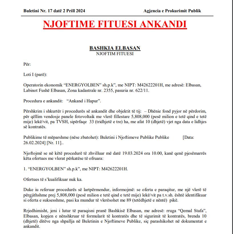 Më 2 Prill 2024 Bashkia Elbasan pat shpallur njoftimin paraprak për këtë procedurë konkurruese ku njoftonte si fitues Operatorin ekonomik të vetëm pjesëmarrës ‘ENERGYOLBEN’ sh.p.k’.
