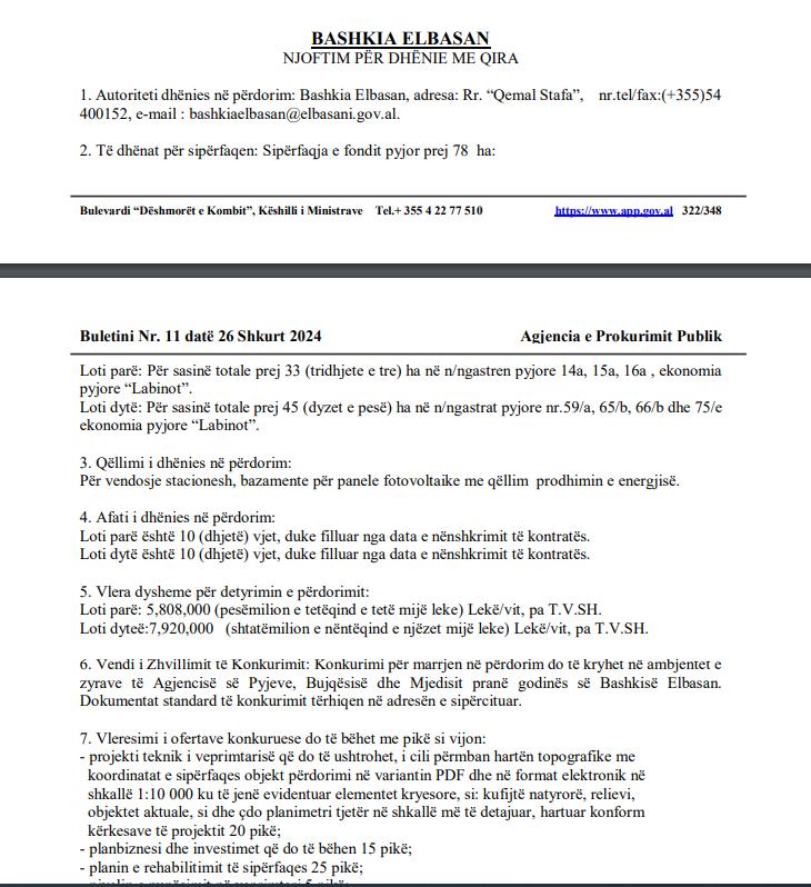 “Më 26 Shkurt 2024, Bashkia Elbasan shpalli njoftimin për dhënien me qira të sipërfaqes 33 ha në fshatin ‘Labinot’ për 10 vite. Qëllimi i dhënies në përdorim: Për vendosje stacionesh, bazamente për panele fotovoltaike me qëllim prodhimin e energjisë.