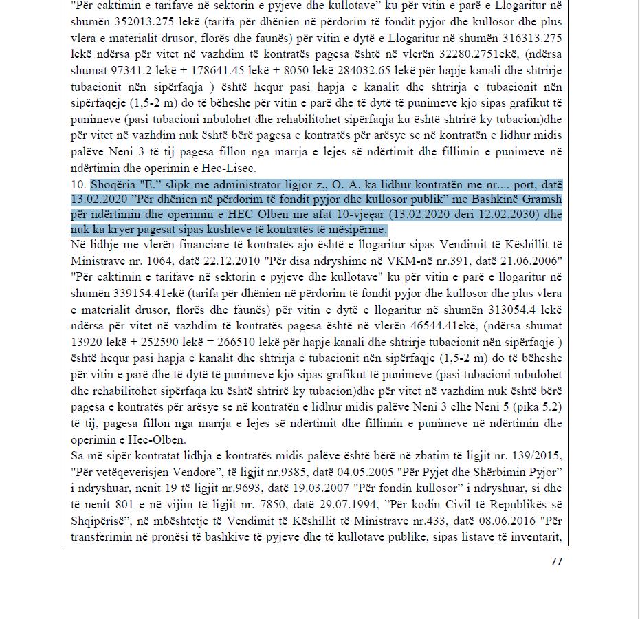 Sipas KLSh Shoqëria ‘Eltex’ me administrator ligjor Oltion Asllani, më 13 shkurt 2020, ka lidhur kontratë ‘Për dhënien në përdorim të fondit pyjor dhe kullosor publik’ me Bashkinë Gramsh për ndërtimin dhe operimin e HEC Olben me afat 10-vjecar dhe nuk ka kryer pagesat sipas kushteve të kontratës të mësipërme.