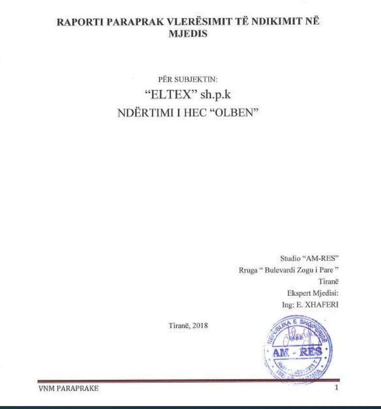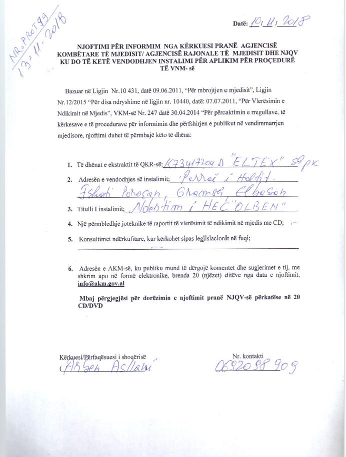 Së dyti, Arben Asllani, edhe pse me detyrë drejtues i institucioneve shtetërore është investuar personalisht lidhur me ndërtimin e HEC OLBEN për të cilin, në cilësinë e përfaqësuesit të ELTEX shpk ka paraqitur kërkesë pra Agjencisë së Mjedisit për të cilin është hartuar edhe VNM përkatëse.