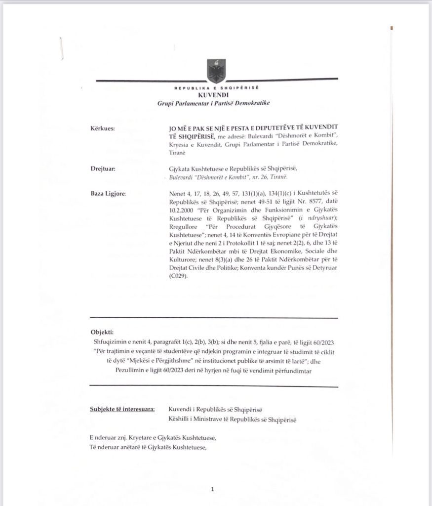 Lajmin e ka bërë me diej kryetari i Grupit Parlamentar Gazment Bardhi, i cili përmes një postimi në rrjetet sociale thotë se Grupi i PD ka mbështetur kërkesën e studentëve. Janë 30 deputetë ata që kanë firmosur, teksa pritet që tashmë çështja të gjykohet nga gjyqtarët e “Kushtetuese’.