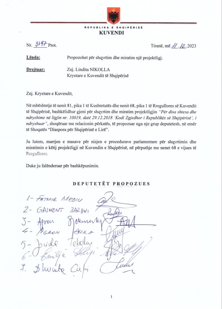 Kreu i grupit parlamentar të PD, Gazment Bardhi, së bashku me Jorida Tabakun, Fatmir Mediun, Agron Duka, Emilja Koliqi, Dhurata Çupi dhe Agron Gjekmarkaj, kanë firmosur kërkesën drejtuar kryetares së Kuvendit, Lindita Nikollës.