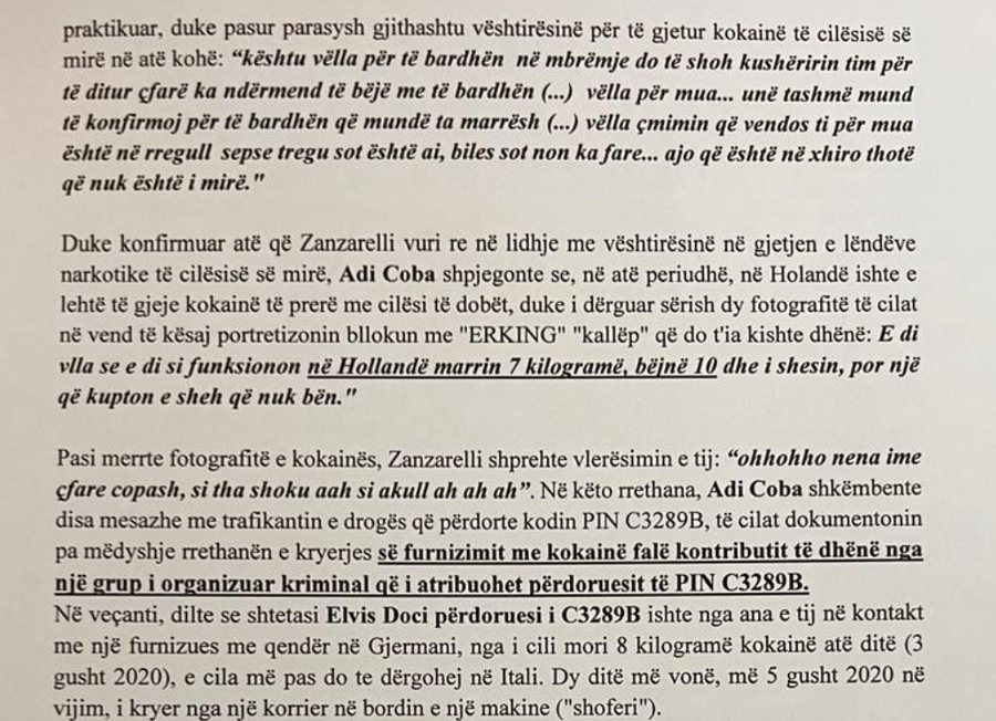 Sipas SPAK, sasia e kokainës është dërguar nga Gjermania në Itali në gusht të vitit 2020 dhe bisedat përfshijnë drejtpërdrejt të akuzuarit në trafikun ndërkombëtar të lëndëve narkotike.