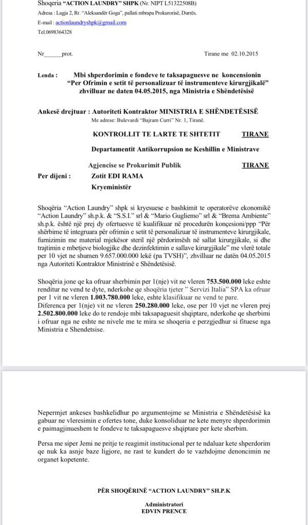 “…në 2 Tetor 2015 operatori ekonomik “Action Laundry”, ka njoftuar përmes një shkrese kryeministrin e vendit, Kontrollin e Lartë të Shtetit, Ministrinë e Shëndetësisë dhe APP-në, mbi shpërdorimin e fondeve të taksapaguesve në konçesionin e ofrimit të setit të personalizuar të instrumentave kirurgjikale të zhvilluar në datën 4 Maj 2015 nga ministria e Shëndetësisë…”.