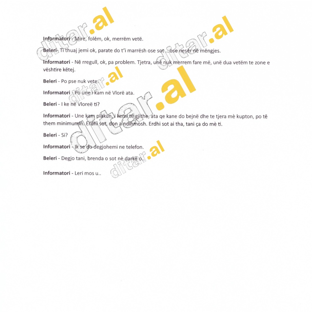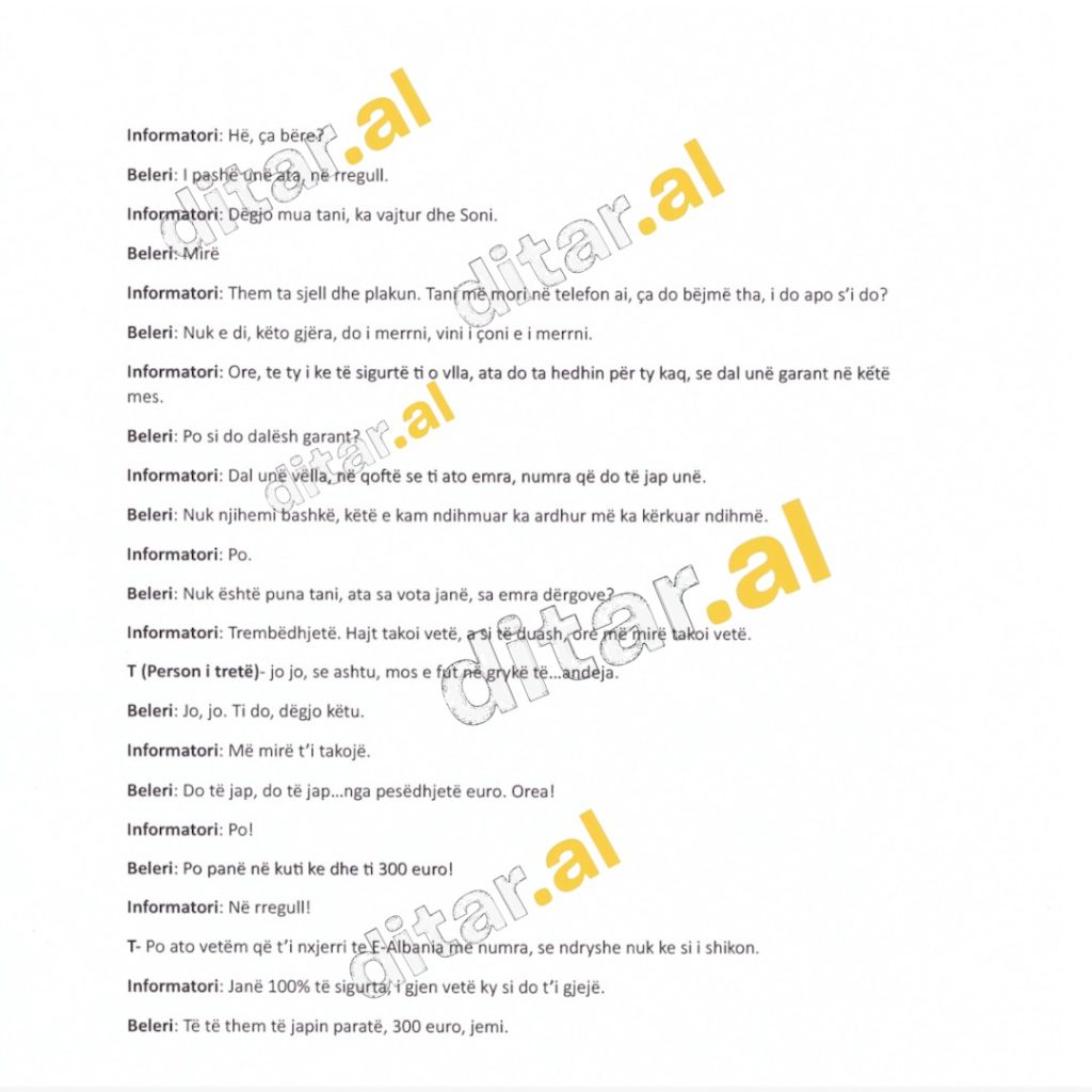 Ndërkohë, Media Ditari ka zbardhur përgjimet të cilat kanë “fundosur” Fredi Belerin. Në përgjimet ekskluzive që disponon Media Ditari, Beleri bisedon me informatorin dhe i premton 50 euro për 13 vota që të nesërmen dhe 300 euro për vetë informatorin nëse votat do të dilnin në kuti. Informatori i thotë që të mos shqetësohet se i ka votat e sigurta dhe se ai do të dalë garant për këto vota.