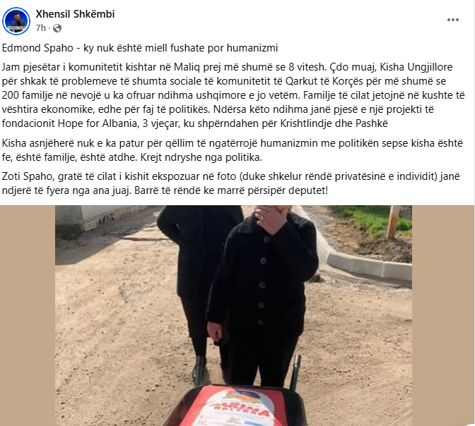 Sot, deputeti demokrat Edmond Spaho ka akuzuar dhe kërcënuar se do ta çojë në SPAK gazetarin Xhensil Shkëmbi, pasi ky i fundit ka shpërndarë thasë me miell për familjet në nevojë, për shkak se është pjesëtar i komunitetit kishtar në Maliq, ku Kisha Ungjillore çdo muaj ndihmon më shumë se 200 familje në nevojë.
