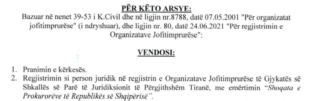 Në reagimin e tij kundër Shoqatës së Prokurorëve, kryeministri Edi Rama shkruante se kjo shoqatë ishte ende e paregjistruar sipas ligjit, por brenda afateve kohore.