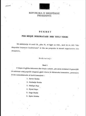 Për fat të mirë, ky dekret u bë i njohur më 2017 nën titullin e zakontë bombastik të gazetave të Shqipërisë: “Publikohet dekreti i Berishës”. Siç njofton gazeta, dekretin e pati publikuar në Facebook drejtori (i asokohshëm) i Institutit të Studimeve për Krimet dhe Pasojat e Komunizmit, z. Agron Tufa. Ca vite më vonë, më 2023, ish presidenti Berisha shërben përmes rrjeteve sociale të njëjtat imazhe të dekretit me të njëjtin qëllim: për të provuar se ai është çdekoruesi i Enver Hoxhës. Mirëpo, teksa nuk ka vlerë ligjore, vallë, çdekorim është ky, a s’është çdekorim? Matanë deklaratave në figurë dhe zë, kur vjen çasti për të verifikuar qëndrimet e njëmendta të institucioneve, në të shkuarën e afërt dhe të sotshmen, shohim, fatkeqësisht, se askush s’e ka seriozisht qëndrimin ndaj ish diktatorit të Shqipërisë, Enver Hoxhës.