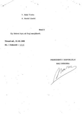 Kthehemi tek figura historike që solli debatin, tek Enver Hoxha. Teksa gjatë periudhës së Shqipërisë socialiste kujtimi i tij u përjetësua në emërtesa institucionesh dhe përmes një mizërie bustesh në çdo institucion e në shumë sheshe të qyteteve të Shqipërisë, ky kujtim u kontestua dhe u largua nga qarkullimi me heqjen apo shembjen e busteve të tij, kudo ku ishin vendosur. Kundërshtimi arriti kulmin kur më 20 shkurt 1991 u shemb monumentit i tij në Sheshin “Skënderbej”. Kronologjikisht, data tjetër më e rëndësishme në vijimësinë e çmontimit të kujtimit të tij është data 13 shkurt 1995, kur Presidenti i Republikës së Shqipërisë, Sali Berisha, me Dekretin nr. 1018, i hoqi të gjitha dekoratat dhe titujt e nderit Hoxhës dhe 7 personave të tjerë (Nexhmije Hoxha, Shefqet Peçi, Hysni Kapo, Gogo Nushi, Spiro Koleka, Haki Toska, Haxhi Lleshi, figura 1 dhe 2). Madje, në dekret përmendet edhe motivi: për aktin kriminal të gjenocidit ushtruar ndaj popullit shqiptar. Teknikisht, rezolutat apo deklaratat, vendase apo ndërkombëtare, të cilat i ka pranuar edhe Shqipëria, janë thjesht premtime të nivelit moral, jo detyrime ligjore për zbatim. Ndaj dhe dekreti i mësipërm i Presidentit përbën akt ligjor që kontribuon në mënyrë të rëndësishme për çrrënjosjen e kujtimit të ish-diktatorit. Mirëpo, ky dekret ka një “problem” fare të vogël: nuk është botuar kurrë në asnjë Fletore Zyrtare!