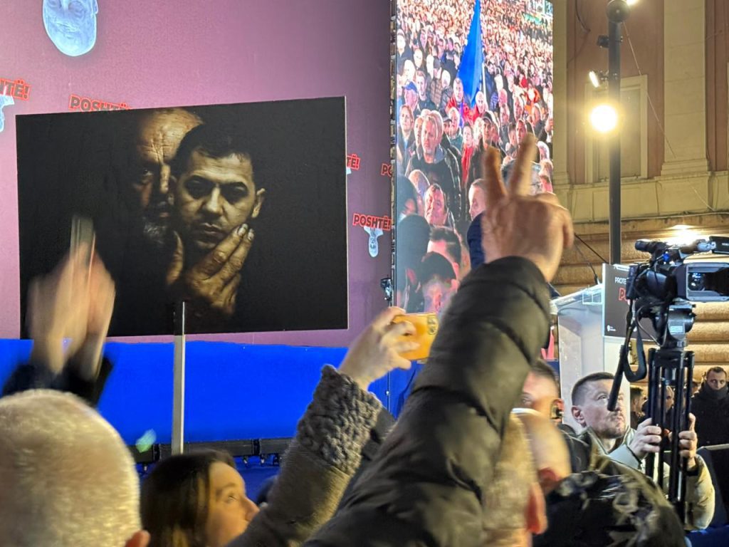 Në një pankartë shihet kryeministri Edi Rama me “fytyrën” e Ergys Agasit, biznesmeni i shpallur në kërkim pas skandalit me tenderët e AKSHI-t.
