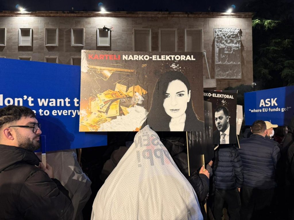 Ndërkohë në një tjetër pankartë shfaqet ish-zv.kryeminisrja Belinda Balluku, teksa krah imazhit të saj shkruhet:  “Karteli narko elektoral”.