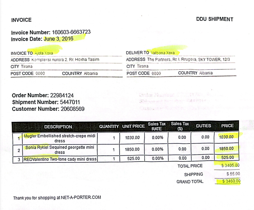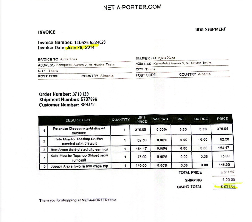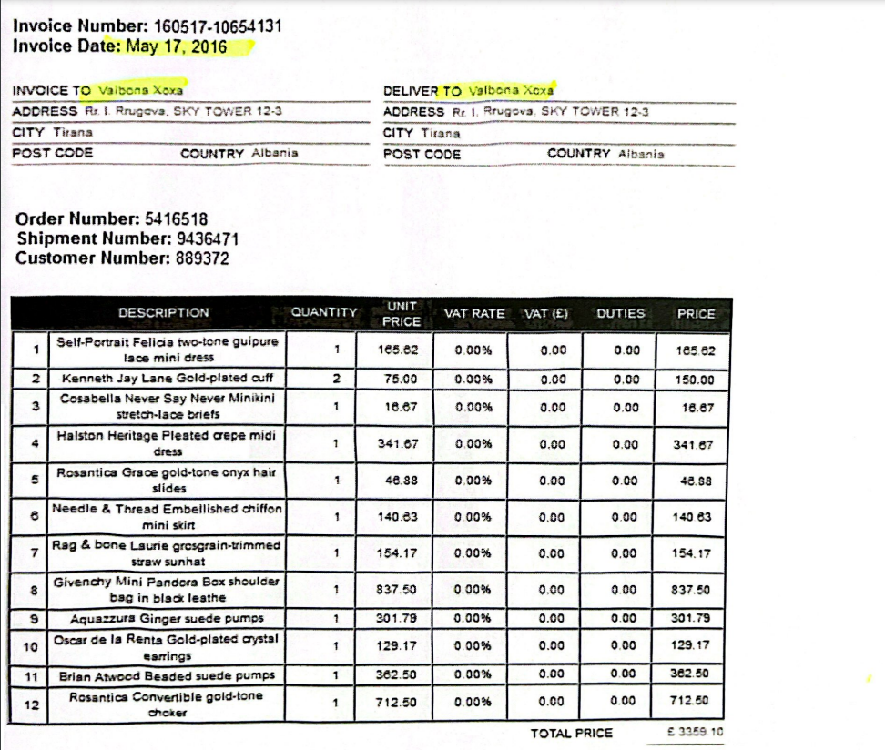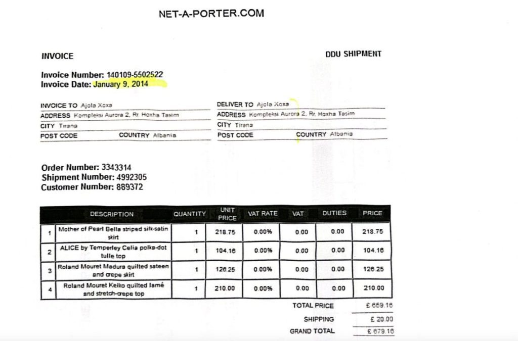 Në një tjetër porosi të bërë në 3 Qershor 2016, Ajola Xoxa ka paguar 3405 paund për 3 fustane, ku vetëm një prej tyre ka kushtuar 1850 paund.
