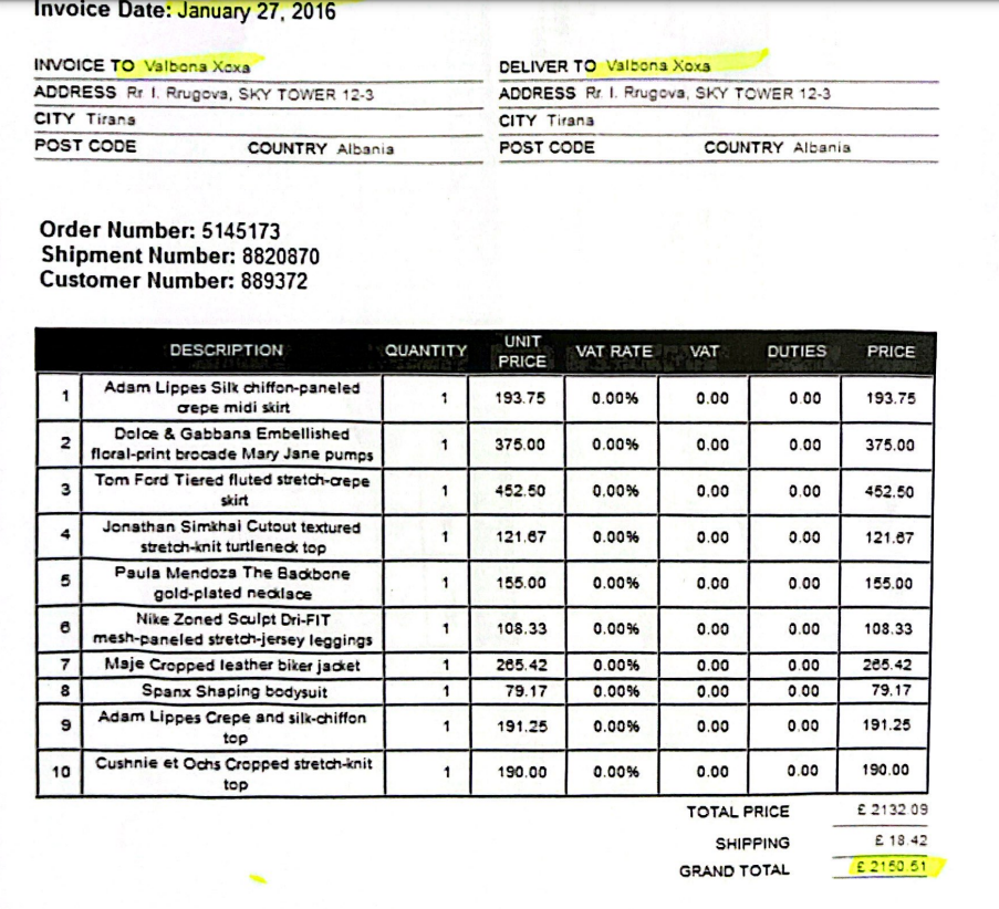 Viti 2016 ka sjellë edhe faturat më të “kripura” të blerjeve online të Ajola Xoxës, ku faturat kalojnë vlera mbi 2 mijë paund.