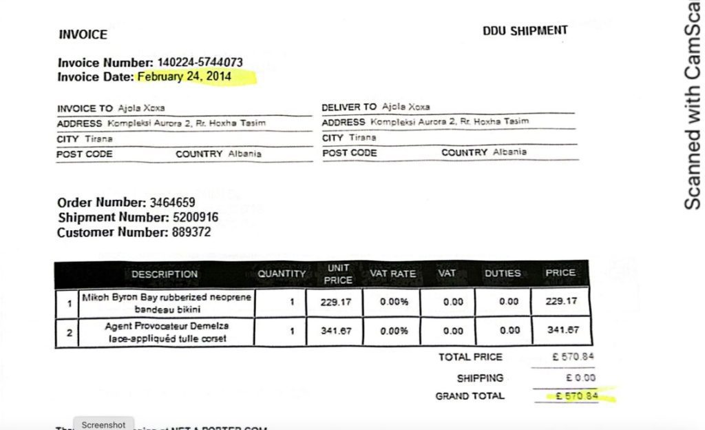 Në 7 Janar 2016, në adresën e Valbona Xoxës, nënës së Ajolës, do të vijnë disa porosi me vlerë 2132 paund, mes të cilëve edhe një fund me vlerë 452.5 paund.