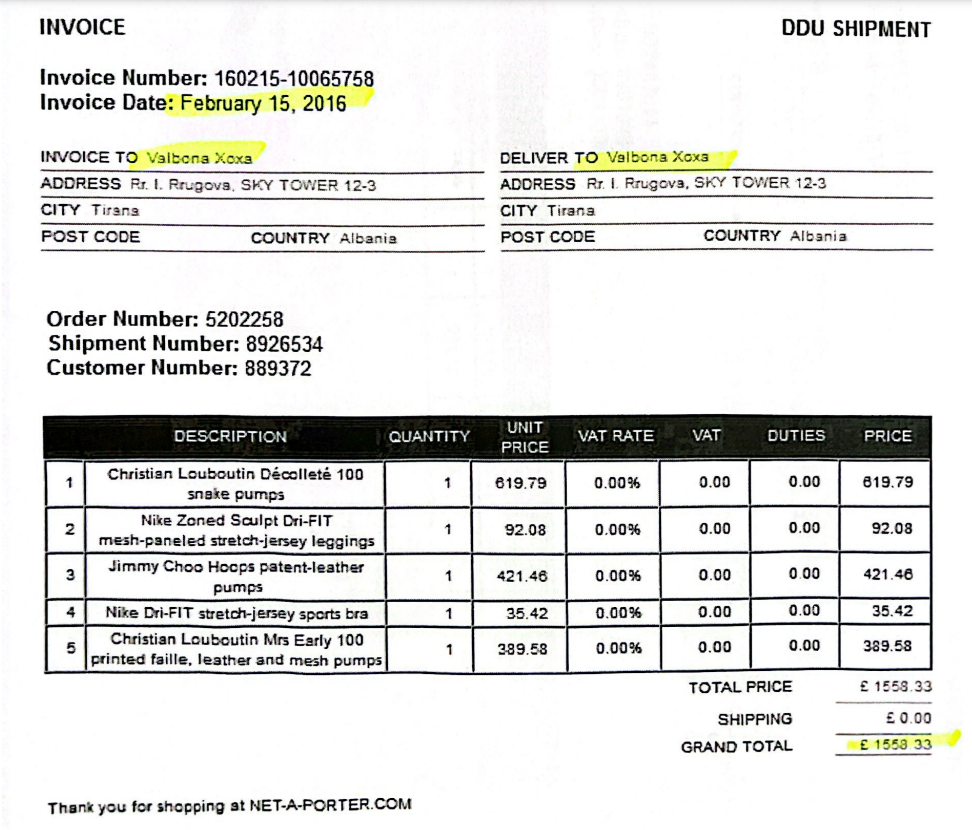 Nuk mund të mungonin edhe një palë këpucë me vlerë 619 paund nga Christian Louboutin, të cilat janë në faturën totale prej 1558 eurosh në 15 Shkurt 2016