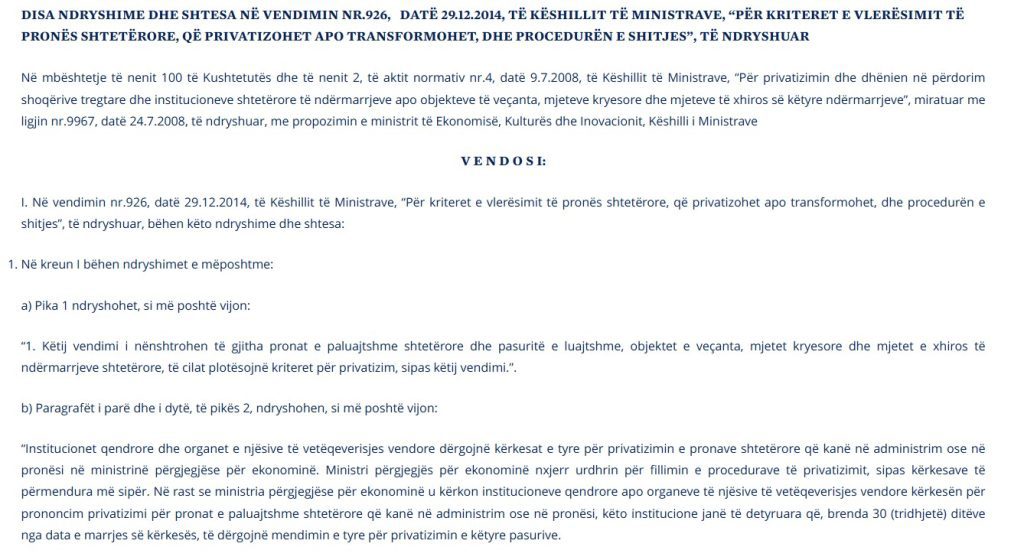 “Ministri përgjegjës për ekonominë nxjerr urdhrin për përfshirjen në procedurë privatizimi të pronës shtetërore, objekt kontrate të dhënë me qira me tarifë 1 euro/kontrata, me sipërfaqe mbi 500 (pesëqind) m2, përpara përfundimit të kontratës së qirasë. Kur në pronën shtetërore të dhënë me qira 1 euro, subjekti ka investuar mbi 5 milionë euro, atëherë atij i lind e drejta e privatizimit të drejtpërdrejtë të truallit me çmimet e përcaktuara në hartën e çmimeve të miratuar me vendim të Këshillit të Ministrave,” thuhet në vendimin e qeverisë.