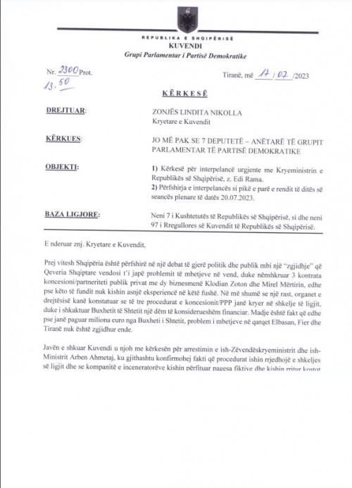 Në kërkesën e nënshkruar nga jo më pak se 7 deputetë demokratë, theksohet se: “Në më shumë se një rast, organet e drejtësisë kanë konstatuar se të tre procedurat e koncesionit/PPP janë kryer në shkelje të ligjit, duke i shkaktuar Buxhetit të Shtetit një dëm të konsiderueshëm financiar. Madje është fakt që edhe pse janë paguar miliona euro nga Buxheti i Shtetit, problem i mbetjeve në qarqet Elbasan, Fier dhe Tiranë nuk është zgjidhur ende”.