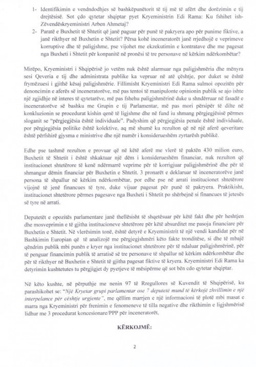 Në kërkesën e dorëzuar këtë të hënë në Kuvend deputetët theksojnë se: “Edhe pse tashmë rezulton e provuar që në këtë aferë me vlerë të paktën 430 milion euro, Buxhetit të Shtetit i është shkaktuar një dëm i konsiderueshëm financiar, nuk rezulton që institucionet shtetërore të kenë ndërmarrë veprime për të korrigjuar paligjshmërinë dhe për të shmangur dëmin financiar për Buxhetin e Shtetit. 3 pronarët e deklaruar të inceneratorëve janë persona të shpallur në kërkim ndërkombëtar, por edhe pse në arrati institucionet shtetërore vijojnë të jenë financues të tyre, duke vijuar pagesat për punë të pakryera. Praktikisht, institucionet shtetërore përmes pagesave nga Buxheti i Shtetit po shërbejnë si financues të jetesës së tyre në arrati”.