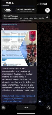 “Të gjitha bisedat dhe korrespondenca e anëtarëve të korruptuar të Kuvendit gjatë muajve të fundit janë në duart e Homeland Justice. Ne jemi shumë më afër jush sesa mendoni. A i keni strehuar vërtetë ata vrasës dhe vrasës fëmijësh? Ne do të sigurohemi që kjo turp të mbetet me ju përgjithmonë”, thuhet në faqen zyrtare të Homeland Justice në Telegram.
