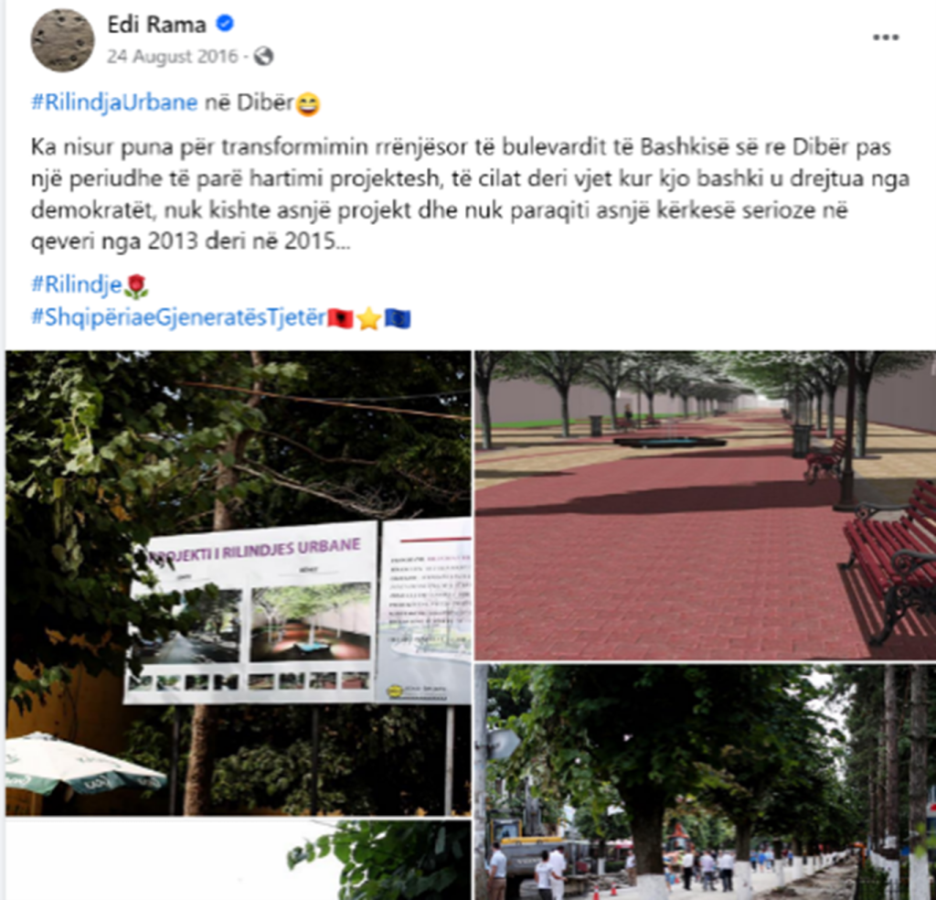 Në vitin 2016 projektin për transformimin e bulevardit kryesor të Peshkopisë, kryeministri, Edi Rama, e përdori për të sulmuar kundërshtarët e tij, politikë, duke e cilësuar një sukses të socialistëve. Në postimin e shpërndarë në Facebook asokohe Rama publikoi edhe pamje të projektit, por zbatimi në terren nuk përputhej me projektin fillestar.