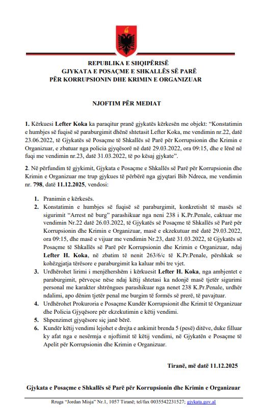 Ish-ministri i Mjedisit, Lefter Koka, ëhstë liruar pas 4 vitesh nga burgu. Vendimi është marrë nga Gjykata e Durrësit, e cila e ka liruar me kusht për inceneratorin e Elbasanit, ndërsa Gjykata e Posaçme ka shuar masën e sigurisë “arrest me burg” për inceneratorin e Fierit.