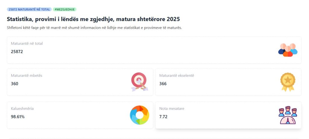 Sipas të dhënave të Portalit Studentor, provimet me zgjedhje i kryen në total 25 mijë e 872 maturantë. 360 maturantë kanë marrë notën 4.00, duke mbetur, ndërsa 366 maturantë kanë arritur të marrin notën maksimale 10.00, duke rezultuar ekselentë.