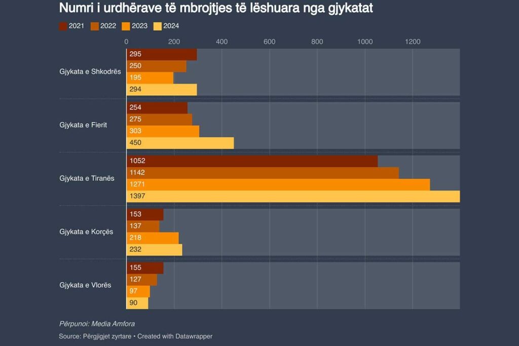 Rastet e dhunës që kanë përfunduar në dyert e gjykatave kanë pësuar rritje të ndjeshme në vitet e fundit, ku spikasin qarqet e mëdha si Tirana dhe Fieri, ky i fundit nga 254 urdhëra mbrojtje të lëshuara në vitin 2020, në vitin 2024 u regjistruan 450 të tillë. Ndërsa Vlora ka ardhur në ulje, nga 157 urdhëra mbrojtje të pranuar në vitin 2020, në 90 të pranuar në vitin 2024.