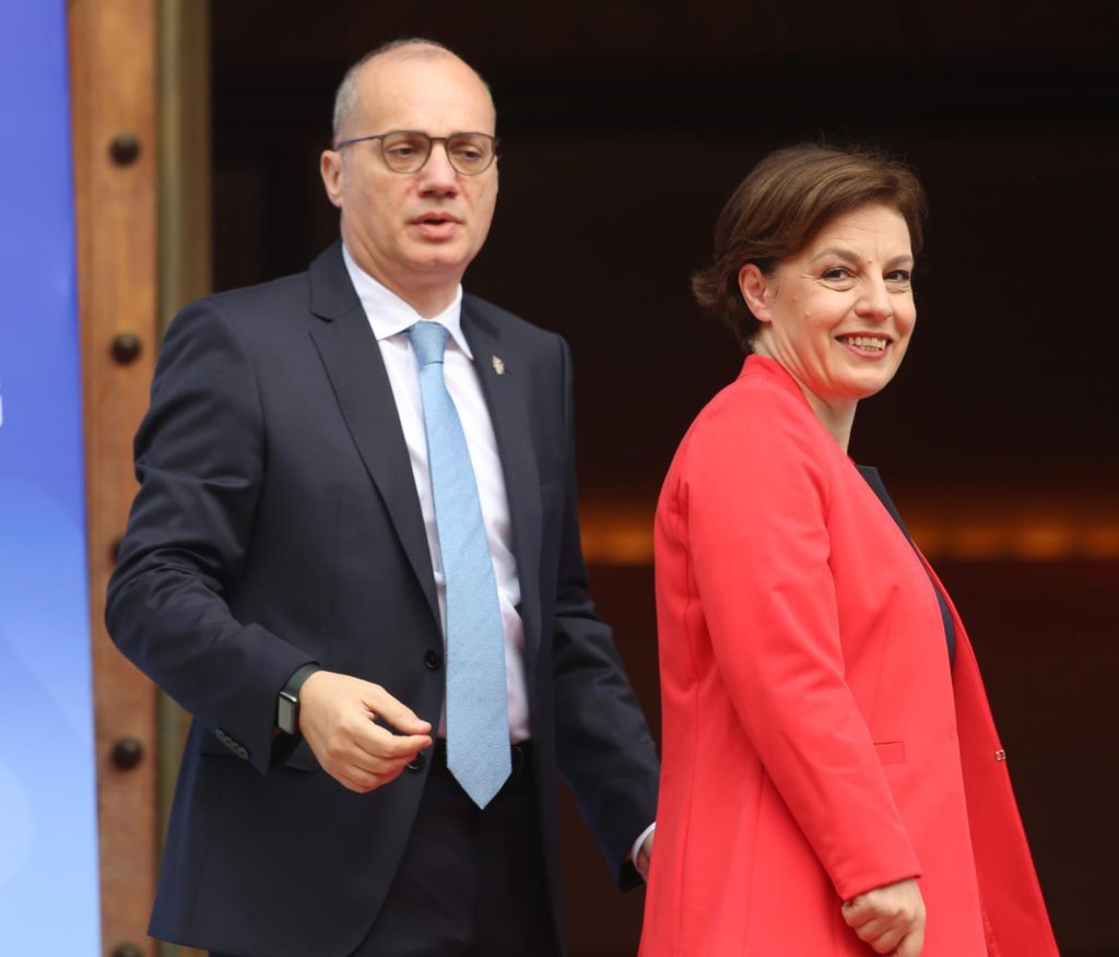 Në foto është edhe ministrja e Jashtme e Kosovës, Donika Gërvalla, që si duket ka ndikuar në zgjedhjen e Dacic për të mos dalë në foto, pas tensioneve në veri të Kosovës.