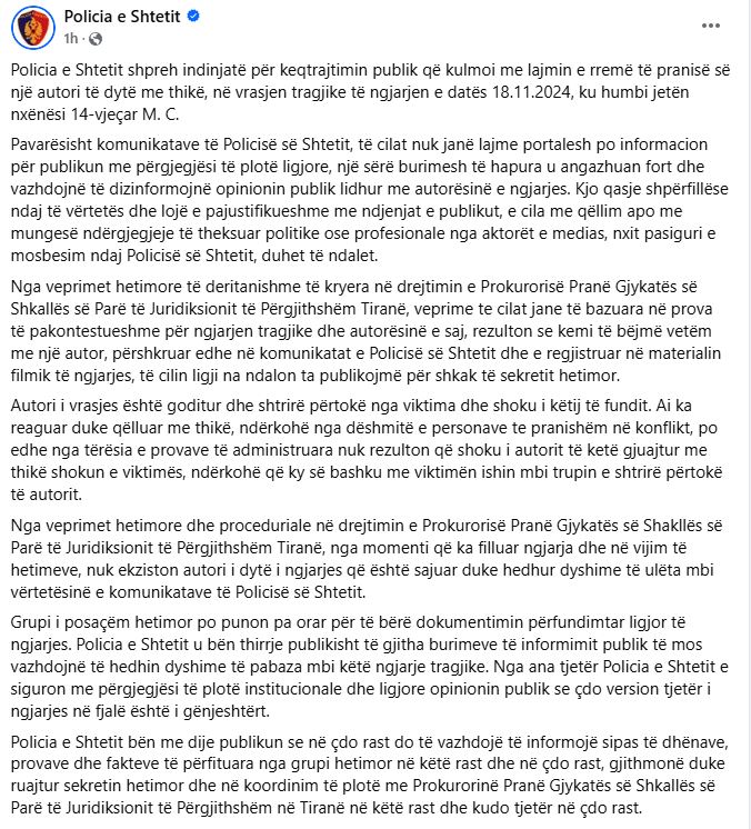 Pas reagimit të parë, sot Policia ka akuzuar sërish mediat se po dezinformojnë publikun, duke deklaruar se ngjarja ka patur vetëm një autor, ndërkohë që ka treguar edhe dinamikën e ngjarjes, ku ndër të tjera thotë se “nuk rezulton që shoku i autorit të ketë gjuajtur me thikë shokun e viktimës”.
