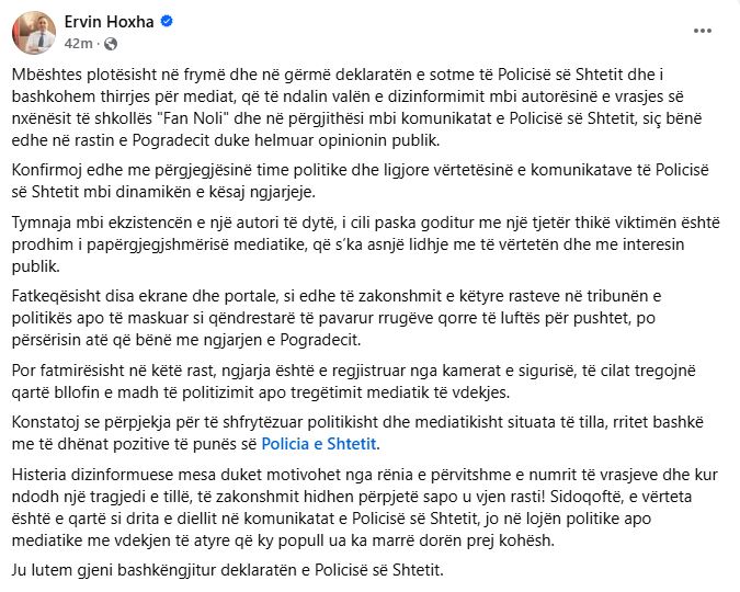 Vetëm disa minuta më vonë ka ardhur edhe një reagim nga Ministri i Brendshëm Ervin Hoxha, i cili shpreh mbështetjen për deklaratën e Policisë së Shtetit, teksa konfirmon edhe me përgjegjësinë e tij politike dhe ligjore vërtetësinë e komunikatave të Policisë së Shtetit mbi dinamikën e kësaj ngjarjeje.