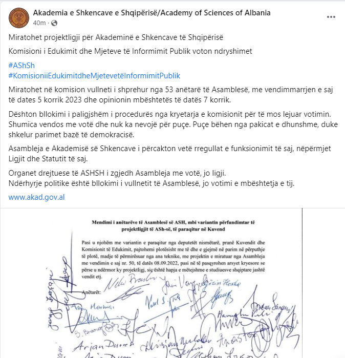 Menjëherë pas miratimit të këtij projektligji ka patur një reagim në faqen zyrtare në Facebook të Akademisë së Shkencave. Në të ka një kundërpërgjigje për opozitën që e quajti këtë një puç të deputetëve të PS për të zgjatur mandatin e Gjinushit.