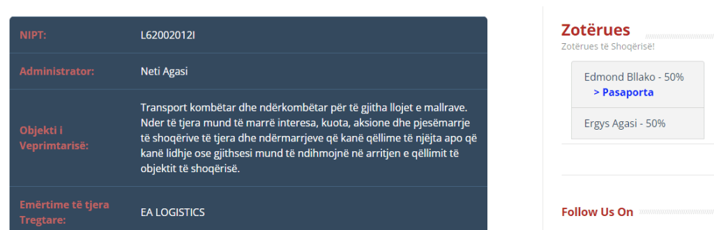 Gjatë kohës që ishte në krye të Inspektoriatit të Mjedisit, Agasi duket se ka krijuar lidhje të forta miqësie me Alqi Bllakon, pasi me babanë e ish-deputetit socialist ka edhe një kompani, “EA LOGISTOCS”, me objekt transportin kombëtar dhe ndërkombëtar të mallrave mallrave.