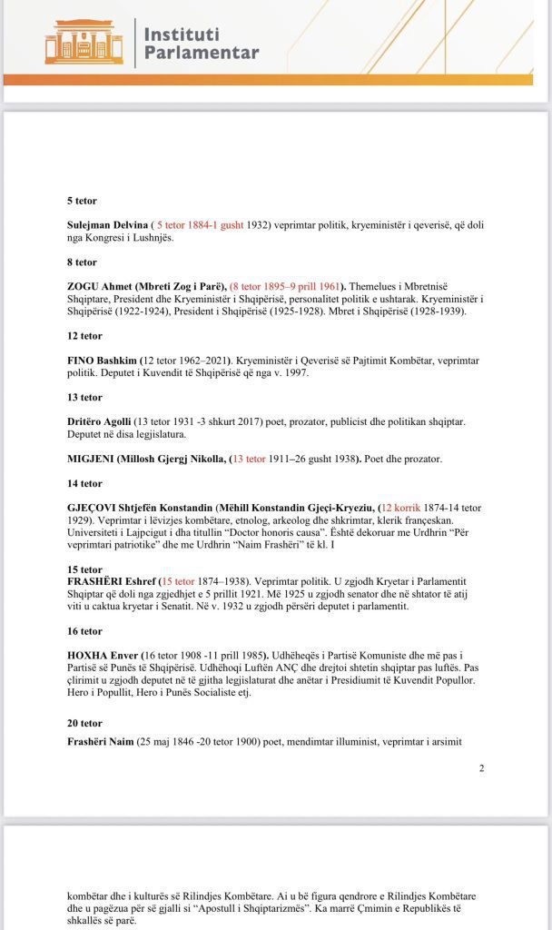 Instituti Parlamentar ka publikuar listën e personaliteteve kombëtare për muajin Tetor, ku shihet se mes figurave si Dritëro Agolli, Naim Frashëri apo Sulejman Delvina, kryetari i Kuvendit Niko Peleshi ka futur edhe ish-diktatorin Enver Hoxha.