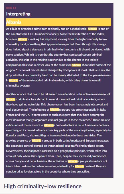 “Si një qendër e krimit të organizuar si në shkallë rajonale ashtu edhe në shkallë globale, Shqipëria është një nga vendet që GI-TOC monitoron nga afër. Megjithatë, që nga përsëritja e fundit e Indeksit, renditja e Shqipërisë është përmirësuar, duke kaluar nga grupi i kriminalitetit të lartë në atë të ulët, diçka që u duk e papritur. Edhe pse ky ndryshim me të vërtetë sinjalizon një ulje të kriminalitetit në vend, ai duhet parë me njëfarë kujdes. Ndërsa është e vërtetë që vendi ka luftuar disa aktivitete kriminale, ndryshimi në renditje është më shumë për shkak të ndryshimit të përbërjes së Indeksit këtë vit. Një vështrim më i afërt i pikëve për Shqipërinë tregon se disa nga 10 tregjet origjinale kriminale kanë ndryshuar me maksimum 0.50 pikë. Kjo do të thotë, rënia në brezin e ulët të kriminalitetit mund t’i atribuohet kryesisht përhapjes së ulët në Shqipëri të tregjeve kriminale të reja të shtuara, të cilat ulin mesataren e përgjithshme të kriminalitetit.