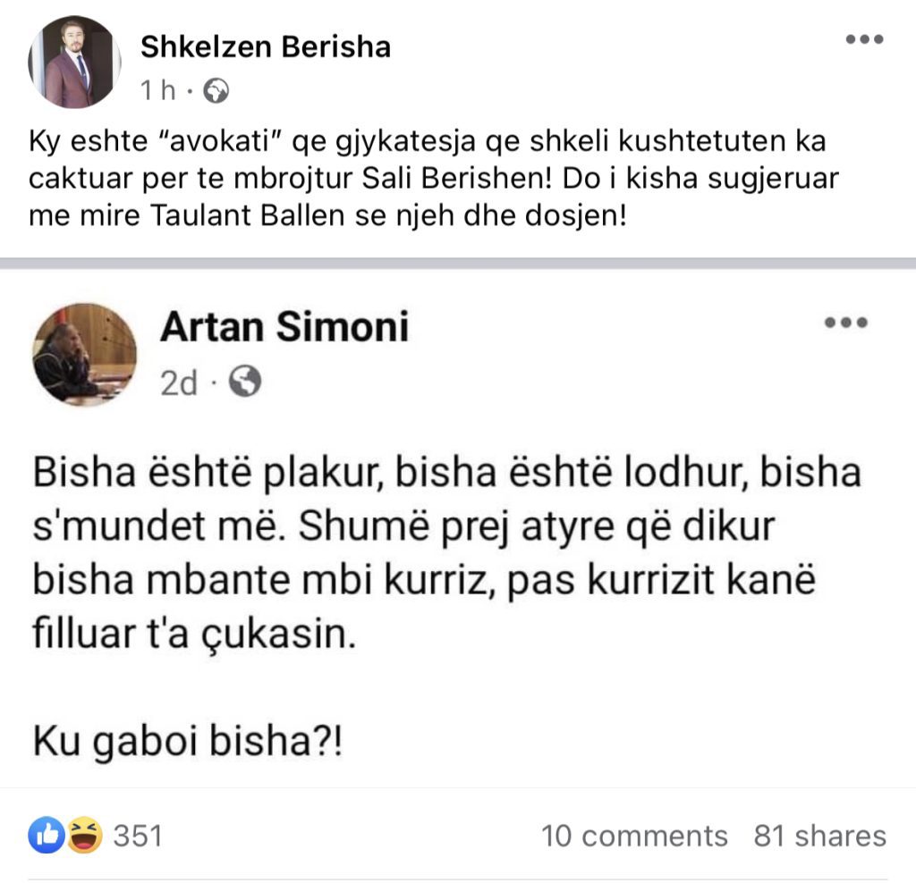 Por postimi i dy ditëve më parë i avokatit Simoni, i ka hapur punë këtij të fundit. Postimin e tij e publikoi Shkëlzen Berisha, ku shihej se avokati sulmonte ish-kryeministrin, ndaj gjykata vendosi ta zëvendësojë me një tjetër.