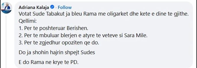 Adriana Kalaja, një tjetër kandidate e PD-së në listë të hapur, e cila siguroi 2826 vota personale, ka hedhur akuza të forta mbi Jorida Tabakun, të cilën e quan “Sude Tabaku”, pasi e akuzon se votat e saj janë blerë nga kryeministri Rama dhe oligarkët e tij.