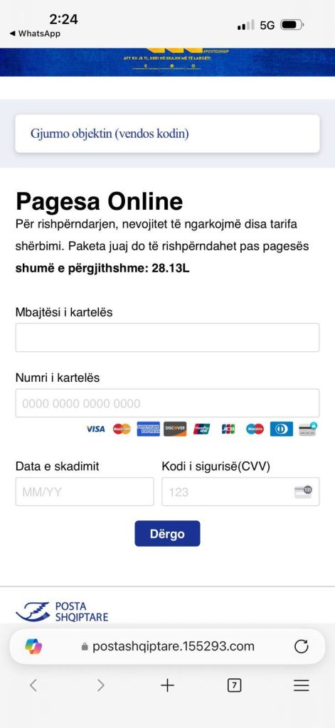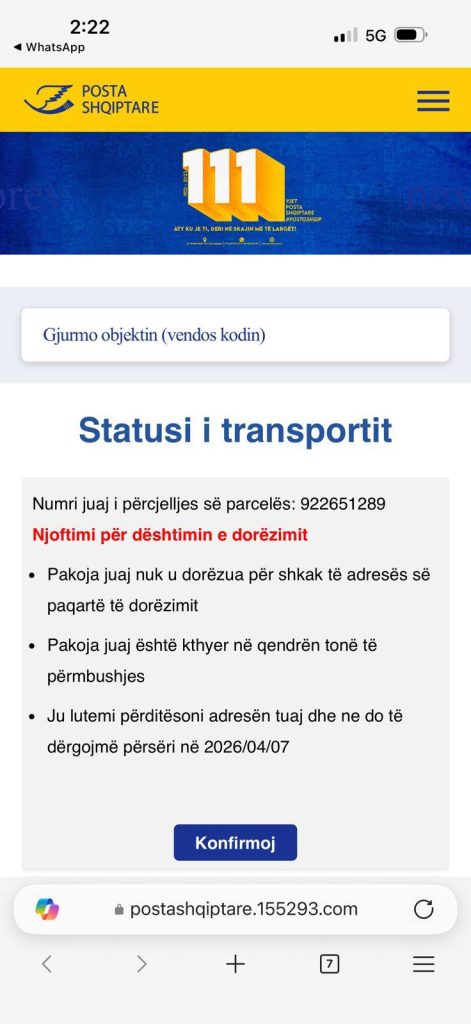 Drejtoria për Hetimin e Krimeve Kibernetike ka njoftuar qytetarët për qarkullimin e mesazheve SMS mashtruese, të cilat paraqiten në mënyrë të rreme si njoftime nga shërbimet postare për dorëzimin e pakove.