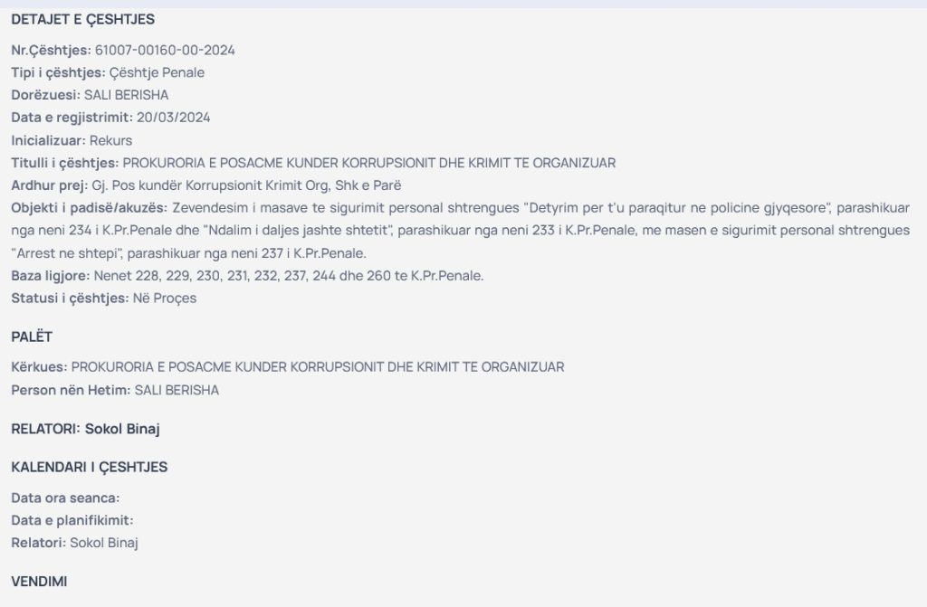 Berisha ndodhet i “izoluar” në banesë që prej 30 dhjetorit të vitit të kaluar, i akuzuar për korrupsion për dosjen “Partizani”. Nëpërmjet avokatëve të tij, Berisha kundërshton ashpërsimin e masës së sigurisë nga “detyrim paraqitje” dhe “ndalim dalje jashtë shtetit” në “arrest në shtëpi”, të lëna në fuqi nga Gjykata e Posaçme e shkallës së parë dhe Apeli i GJKKO.