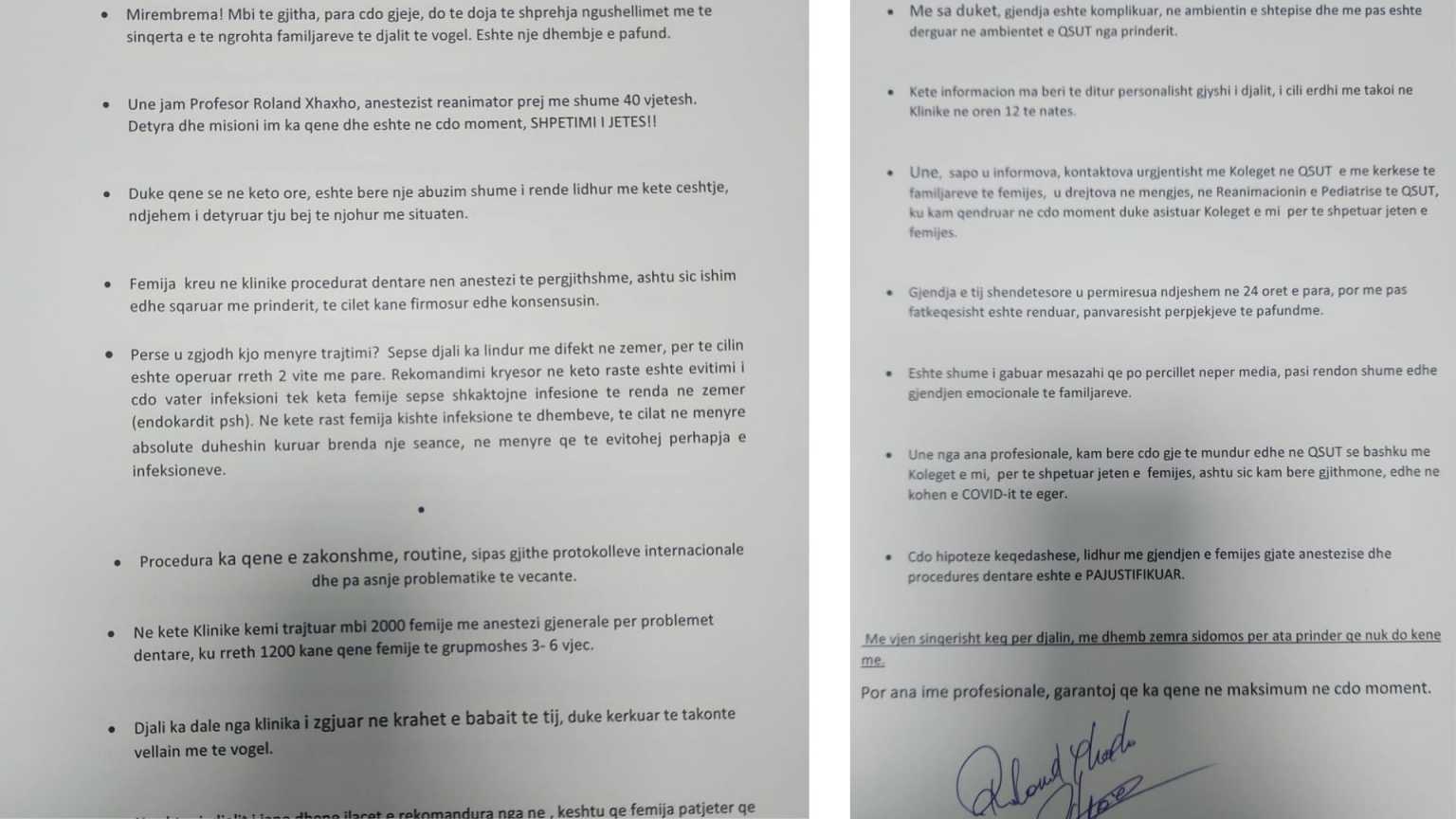 Vetë mjeku ka mohuar gjithë akuzat mbrëmjen e djeshme ku tha se prindërit kishin firmosur për këtë ndërhyrje duke ditur rreziqet, pasi sipas tij fëmija ishte operuar njëherë nga zemra dy vite më parë.