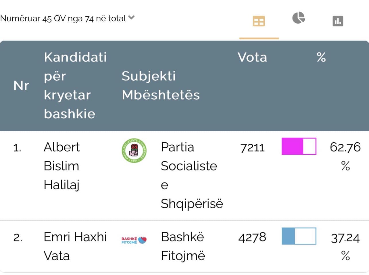 Kur janë numëruar 45 nga 74 kuti, socialisti ka një avantazh prej rreth 3000 votash nga kandidati i “Bashkë Fitojmë”, Emri Vata.
