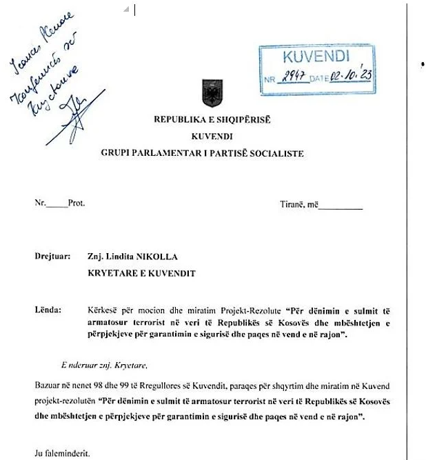 Grupi Parlamentar i PS dorëzoi sot në Kuvend një rezolutë që dënon sulmin me armë në veri të Kosovës, ku u sulmua policia dhe për pasojë u vra rreshteri Afrim Bunjaku.