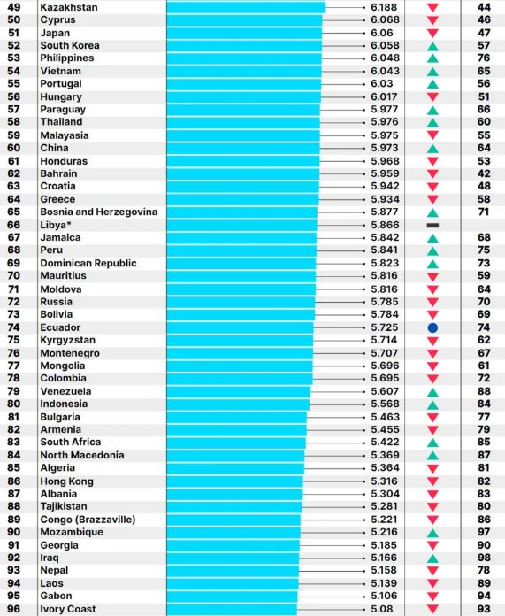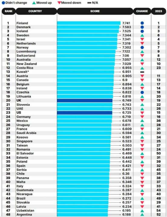 Në anën tjetër, Britania e Madhe zbriti në renditje, duke u renditur në vendin e 20-të pas vendeve si Lituania dhe Republika Çeke, ndërsa SHBA-të ra në vendin e tetë, një ulje krahasuar me pozicionin e tyre në vitin 2023 (e 23-ta këtë vit, e 15-ta në 2023).