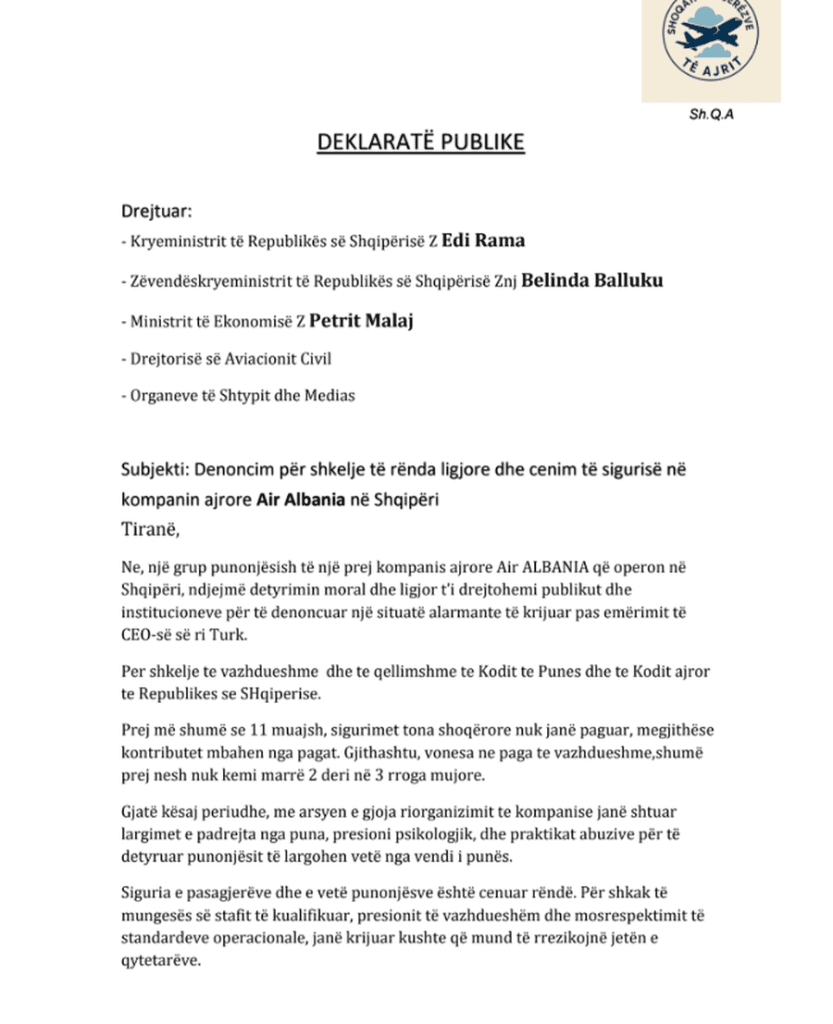 Një grup punonjësish të kompanisë ajrore Air Albania ka ngritur alarmin për shkelje të rënda ligjore, vonesa në paga, shkarkime të padrejta dhe cenim të rëndë të sigurisë së pasagjerëve.
