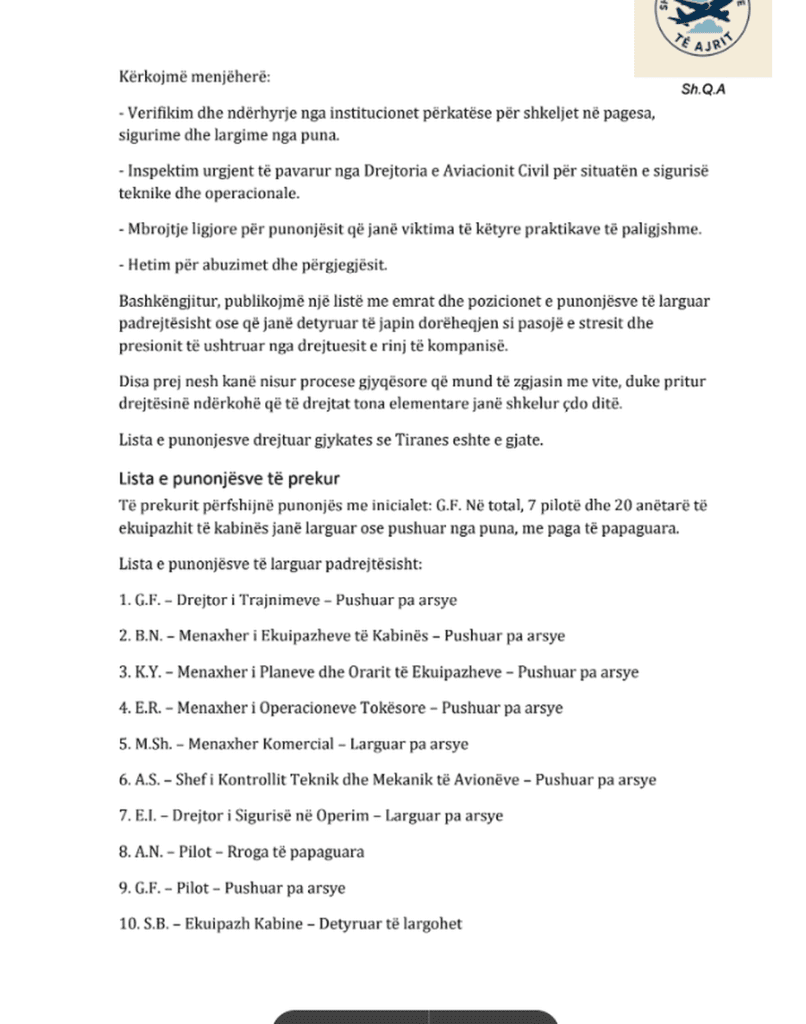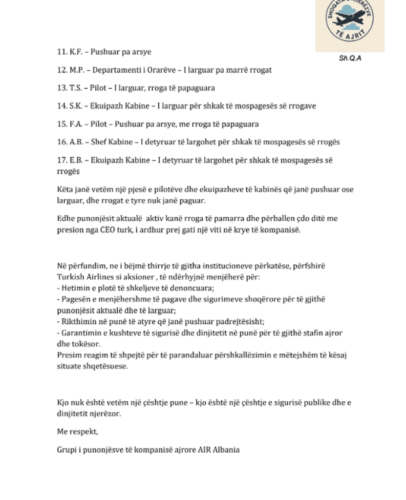 Në deklaratë përmenden me iniciale 17 punonjës të larguar në mënyrë abuzive, ndërsa shumë të tjerë janë në procese gjyqësore që rrezikojnë të zgjasin me vite. Punonjësit paralajmërojnë se mungesa e veprimit urgjent nga shteti mund të përshkallëzojë më tej situatën, me pasoja të rënda për funksionimin normal të linjave ajrore dhe sigurinë e pasagjerëve.